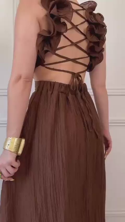Un abito raffinato caratterizzato da intrecci sulla schiena e spalline adornate da delicati fiori, con una linea incrociata in vita e una lunghezza che arriva fino alla caviglia. Disponibile in sette eleganti tonalità.