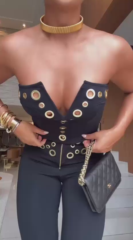 Il Completo Borchiato unisce eleganza e modernità in un raffinato coordinato composto da un top e pantaloni, impreziositi da borchie dorate che donano un tocco di luce e sofisticatezza. Le borchie, posizionate con cura, esaltano le linee pulite del completo, creando un effetto glamour ma discreto. Perfetto per chi desidera un outfit versatile e di classe, adatto a occasioni speciali o serate chic, questo ensemble garantisce un’ottima vestibilità e un fascino senza tempo, ideale per valorizzare la propria personalità con stile e sicurezza.