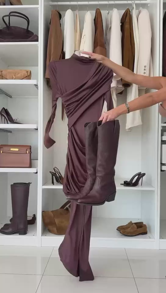 L'abito Jessica esprime una raffinata eleganza grazie al suo design con maniche lunghe e scollo a dolce vita che valorizza la figura in modo delicato e armonioso. La plissettatura drappeggiata avvolge il corpo con una leggerezza che dona movimento e sofisticatezza, mentre la coda laterale aggiunge un tocco di originalità e femminilità. Disponibile in quattro colori attentamente selezionati, questo capo è perfetto per chi desidera un outfit elegante e distintivo, adatto a eventi importanti o serate speciali. Realizzato con materiali di alta qualità, assicura comfort e una vestibilità impeccabile, esaltando lo stile personale con classe e charme.