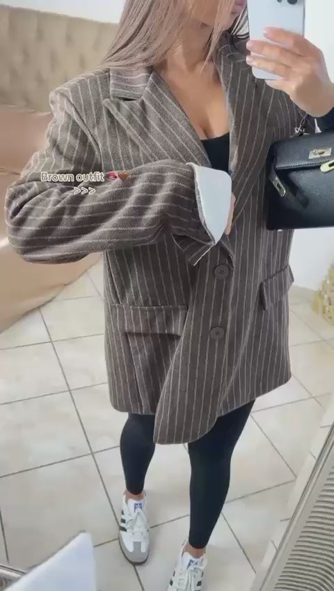 Giacca elegante con motivo a righe, impreziosita da raffinati risvolti bianchi ai polsi e da un'essenziale chiusura a bottone singolo. Proposta in cinque varianti cromatiche, questo capo rappresenta la quintessenza dello stile sobrio e ricercato, perfetto per chi apprezza i dettagli sartoriali e la semplicità sofisticata.